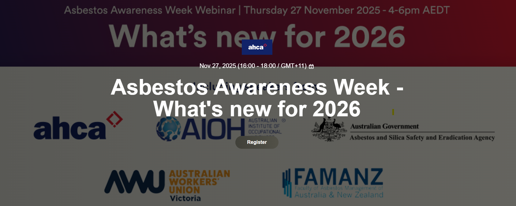 Annual asbestos awareness week webinar hosted by the Asbestos and Hazardous Materials Consultants Association (AHCA) and Australian Institute of Occupational Hygienists (AIOH). Special guest speakers from WorkCover WA, Australian Workers Union | Victorian Branch, Asbestos and Silica Safety and Eradication Agency and Faculty of Asbestos Management of Australia & New Zealand.