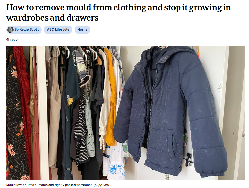 In this ABC Lifestyle article, environmental and occupational hygiene perspectives are explored to explain why mould grows on clothing and how household conditions such as humidity, overcrowded wardrobes, and damp garments contribute to the problem.